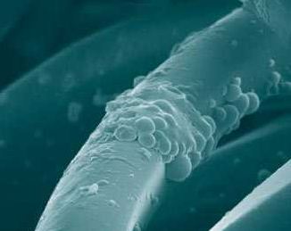 Traitements microcapsulesIntégré au tissus des micro-capsules sont réparties dans l’ensemble de leurs fibres. Ces micro-capsules renferment des produits solides ou liquides capables de réagir à la lumière, à la température ou au frottement et libèrent leur contenu lors de l’utilisation du vêtement. |